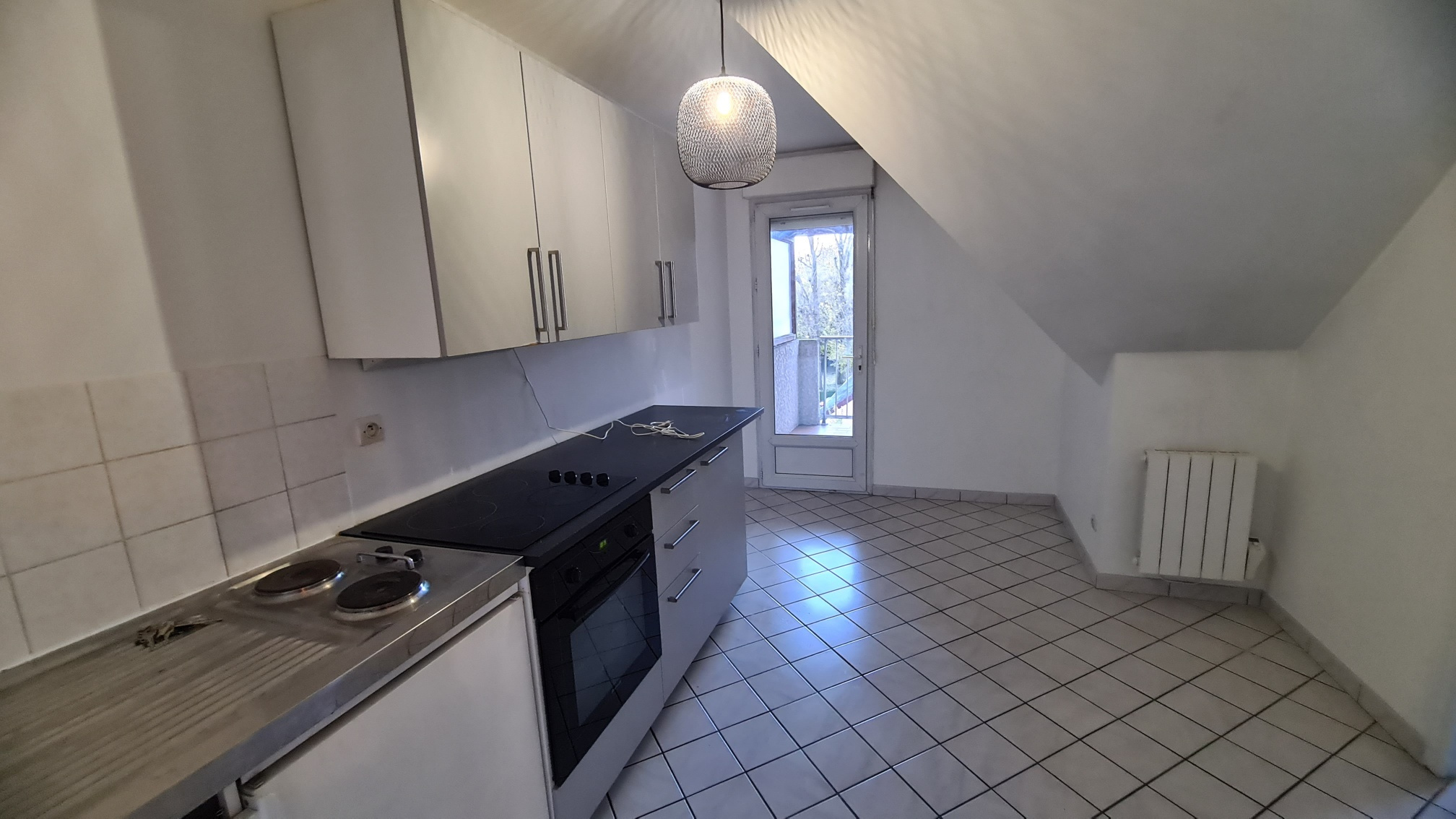10' RER, petit immeuble, Appartement F1 (surface au sol 35,50m²): cuisine aménagée (frigo), balcon, séjour, salle d'eau avec wc.