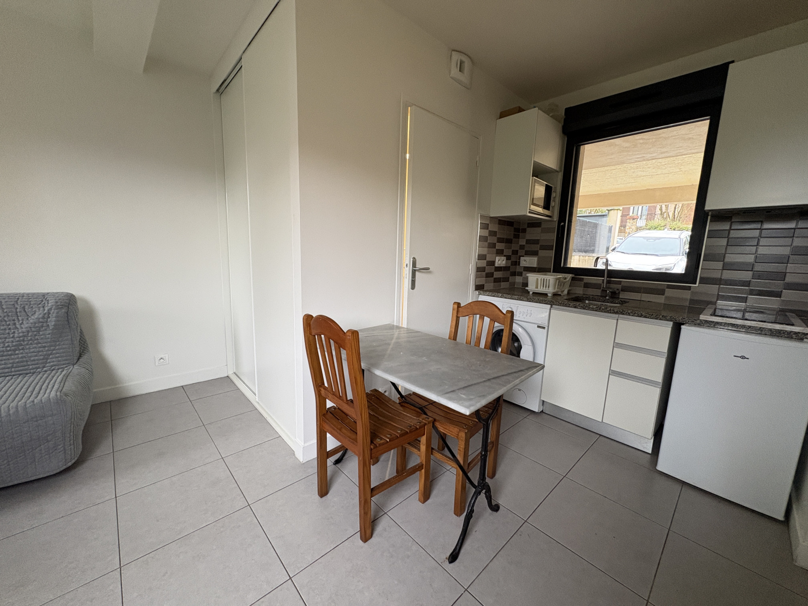 10' RER Lozère, petit immeuble récent dans quartier pavillonnaire, Studio MEUBLE, très bon état comprenant: séjour, coin-cuisine équipé ( plaques, hotte, frigo, micro ondes, lave linge) salle d'eau avec wc, rangements.