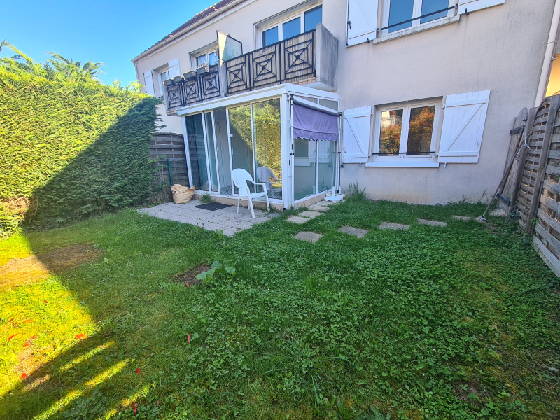 10' RER, petite résidence calme, appartement 2 pièces avec jardin : coin-cuisine aménagé, plaques, hotte, four, séjour, vérandas, terrasse, jardin, chambre, salle d'eau aménagée, rangements.