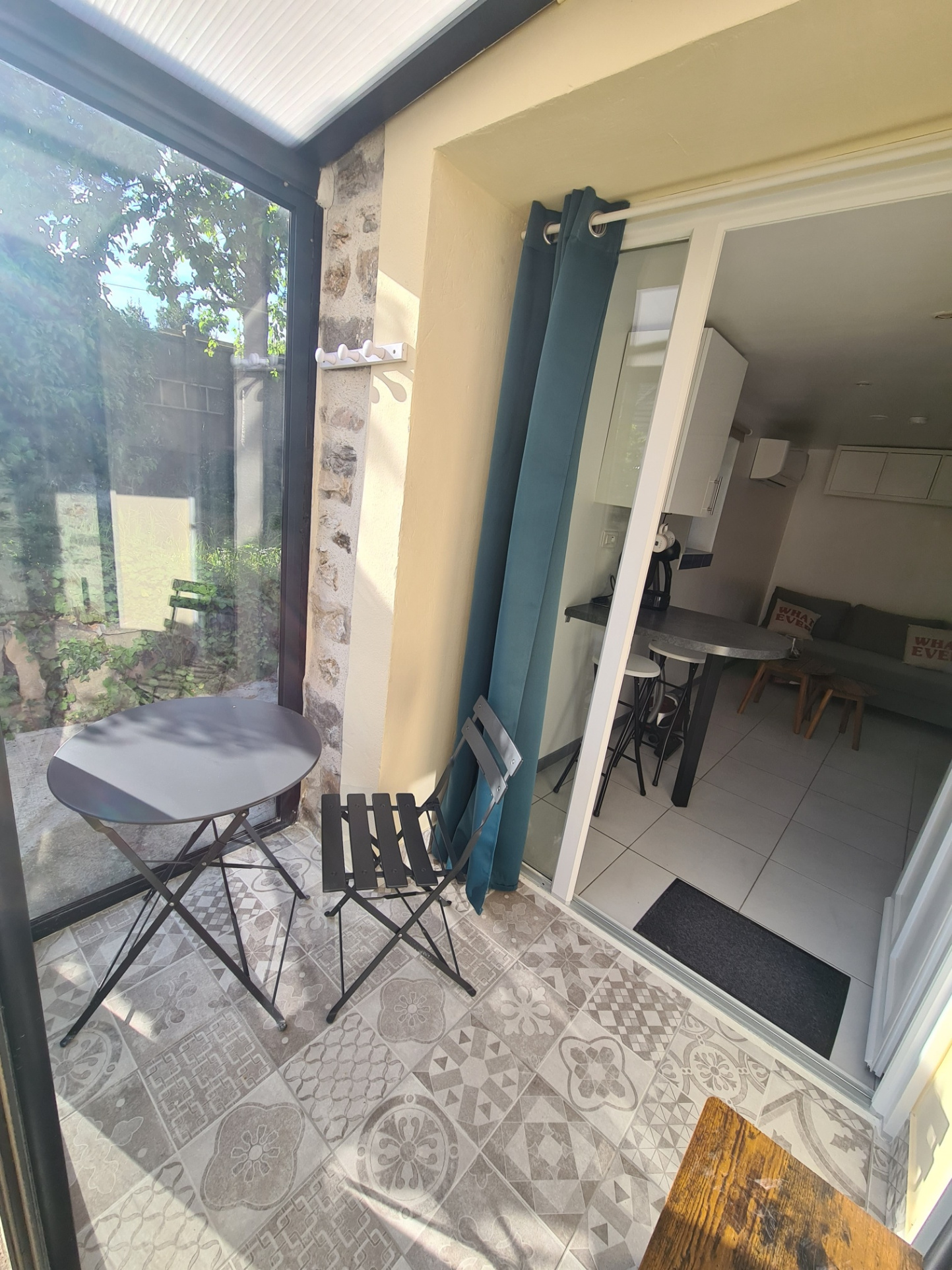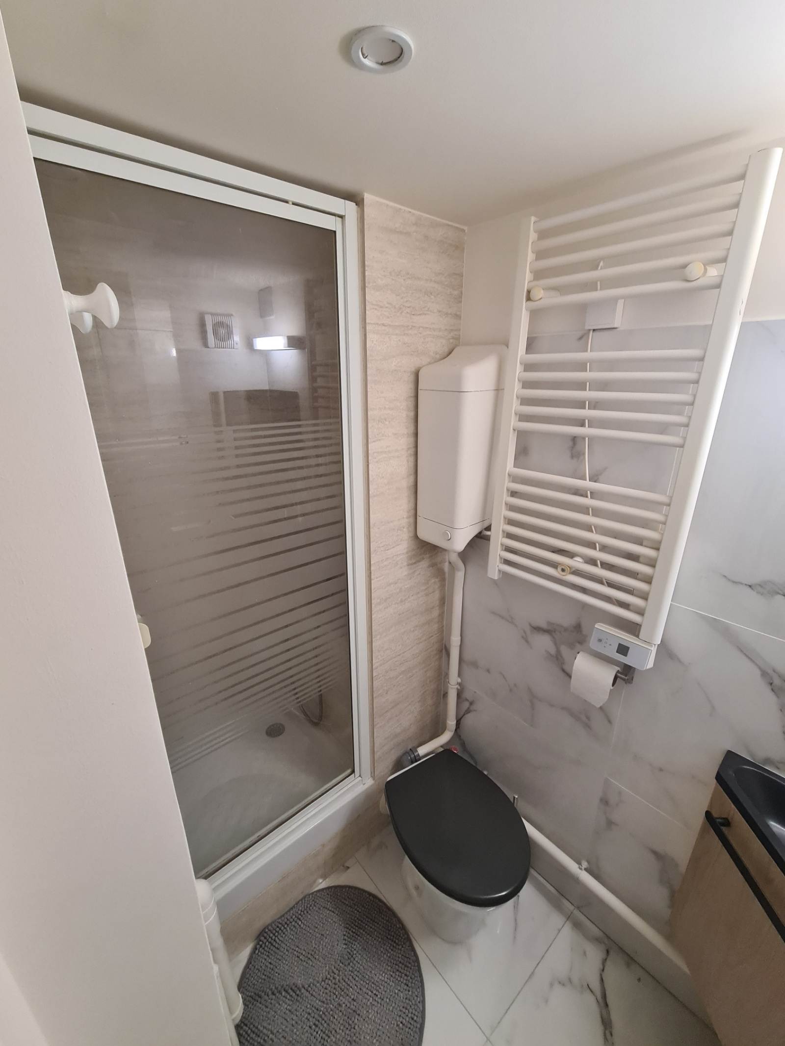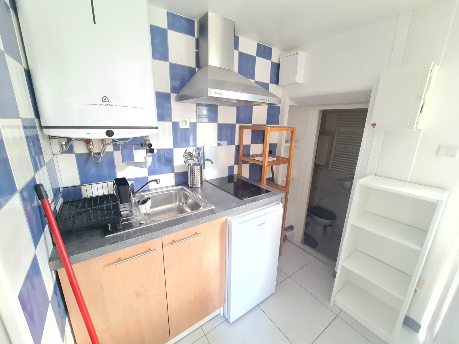 Petit immeuble rural proche commerce, studette meublée : coin-cuisine équipé (plaques, hotte, frigo, micro-ondes, séjour, verrière, salle d'eau avec wc.